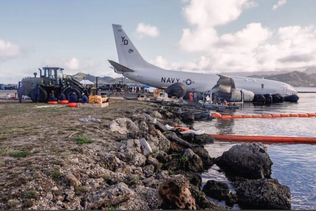 The image shows a U.S. Navy P-8A Poseidon maritime patrol aircraft that has overrun a runway and come to rest partially in the water near a shoreline
