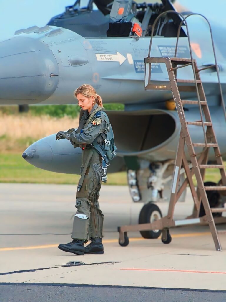The image shows a female pilot in a flight suit and gloves, standing on a tarmac next to a military jet, which appears to be an F-16 Fighting Falcon (based on its general shape, intake design, and canopy area).